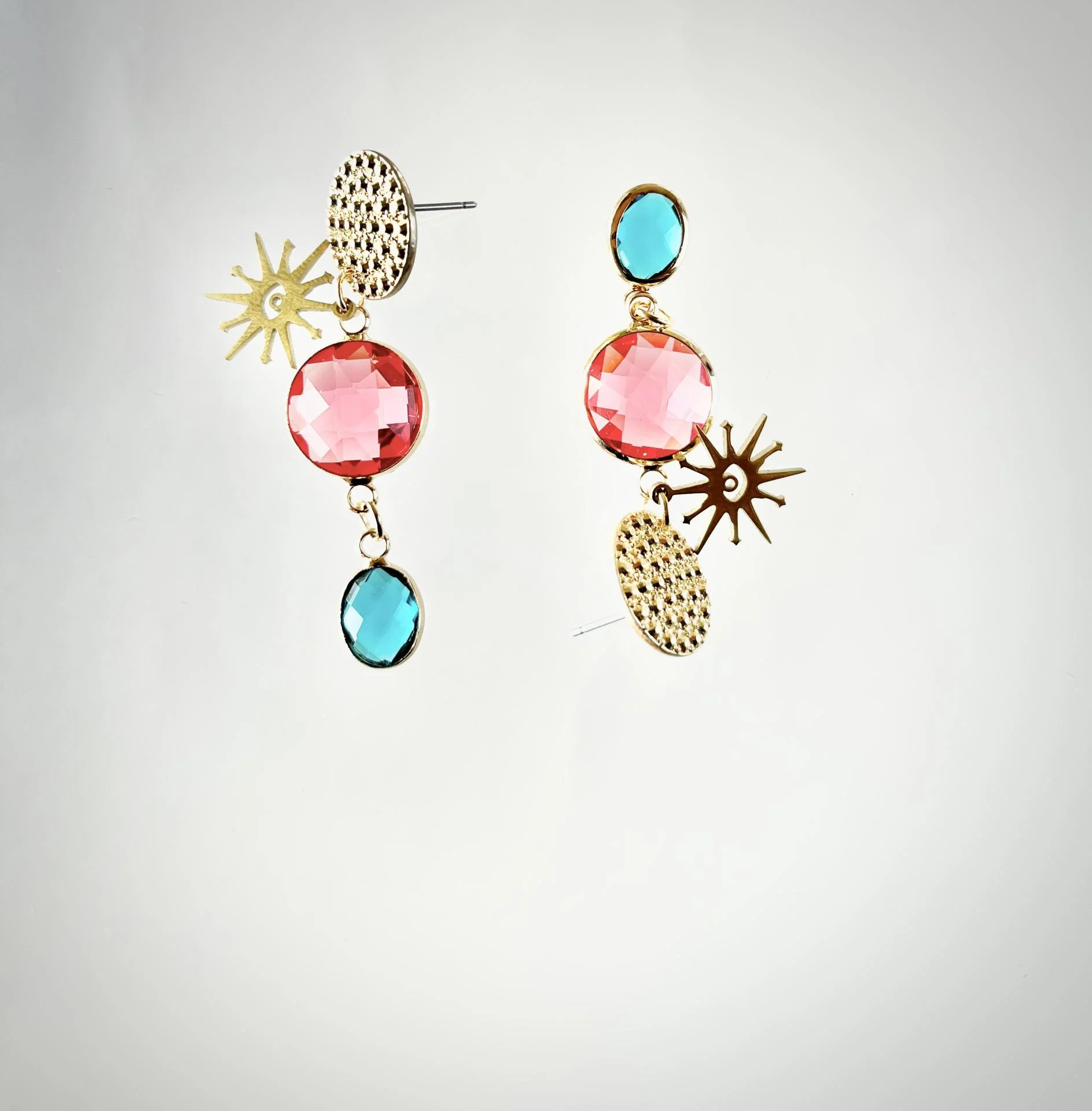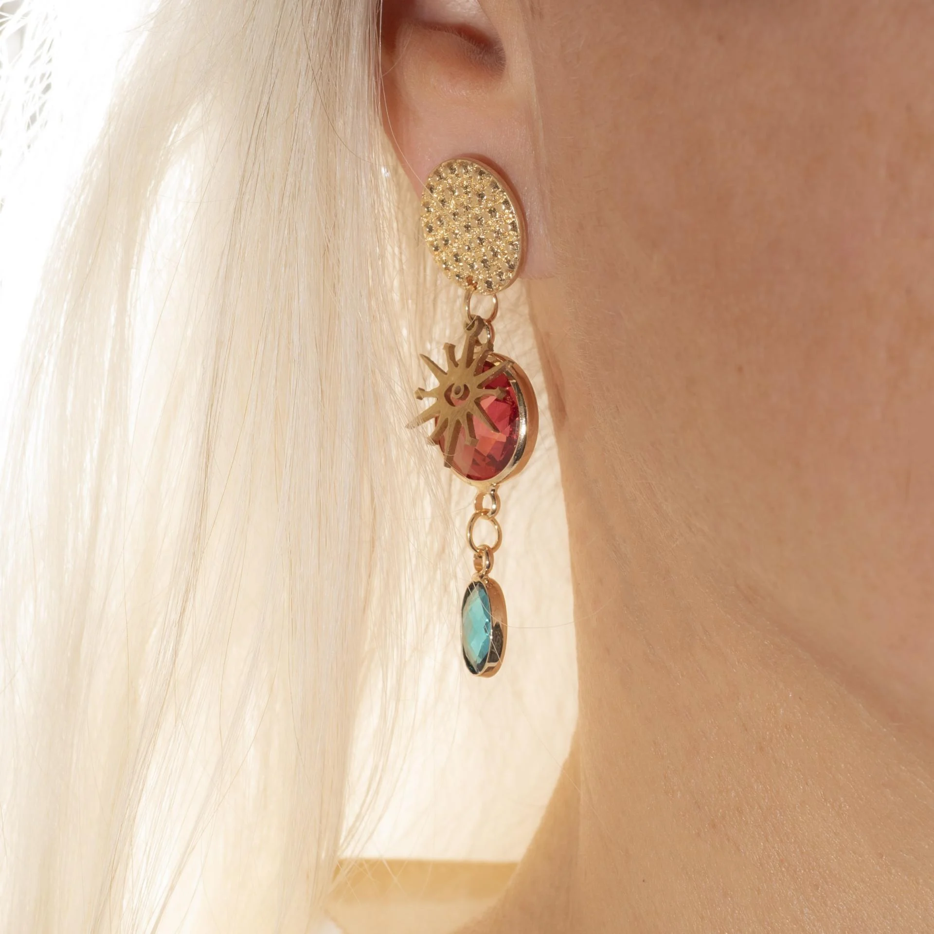 Délicates et lumineuses, ces boucles d'oreilles associent l'éclat du cristal à la chaleur du laiton doré. Leur touche de couleur capte la lumière avec subtilité, apportant une élégance naturelle à chaque mouvement.