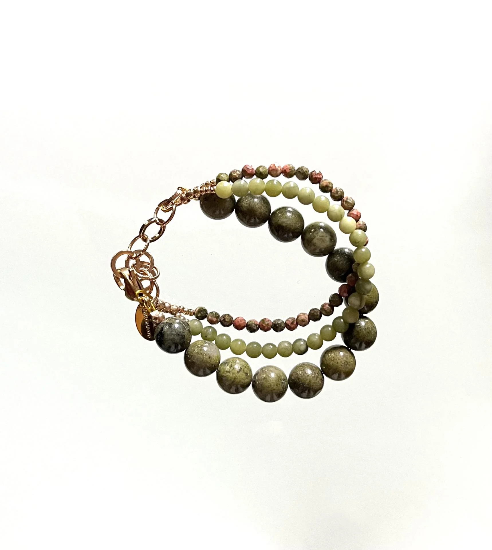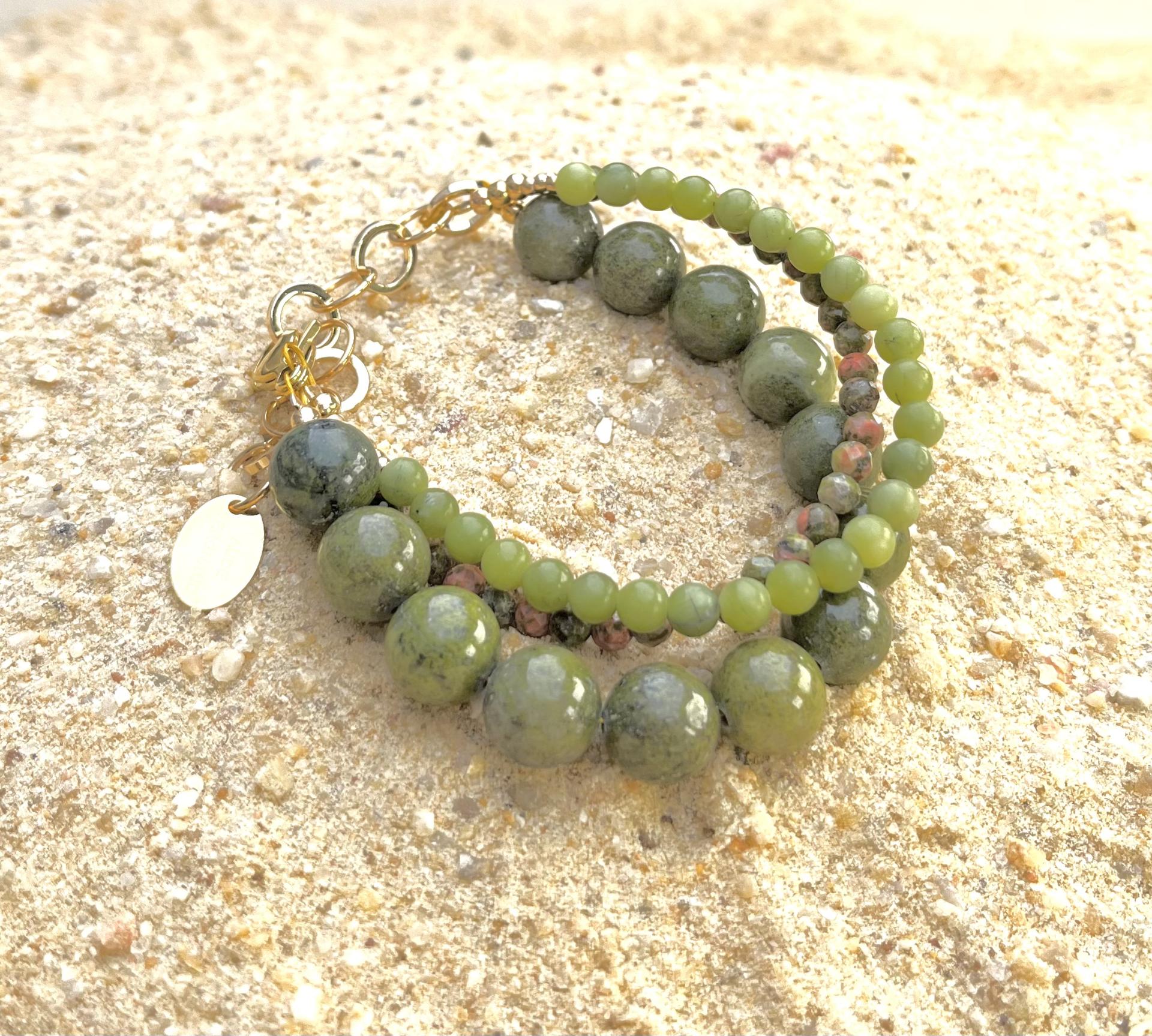 Serenia combine l'harmonie du jade, la guérison de l'unakite et l'équilibre de l'agate. Le jade favorise la prospérité et l'équilibre, l'unakite soutient la guérison émotionnelle, et l'agate apporte stabilité et sérénité. Ce bracelet est idéal pour ceux qui cherchent à harmoniser leur énergie intérieure et à apporter une touche de calme et d'équilibre à leur quotidien.