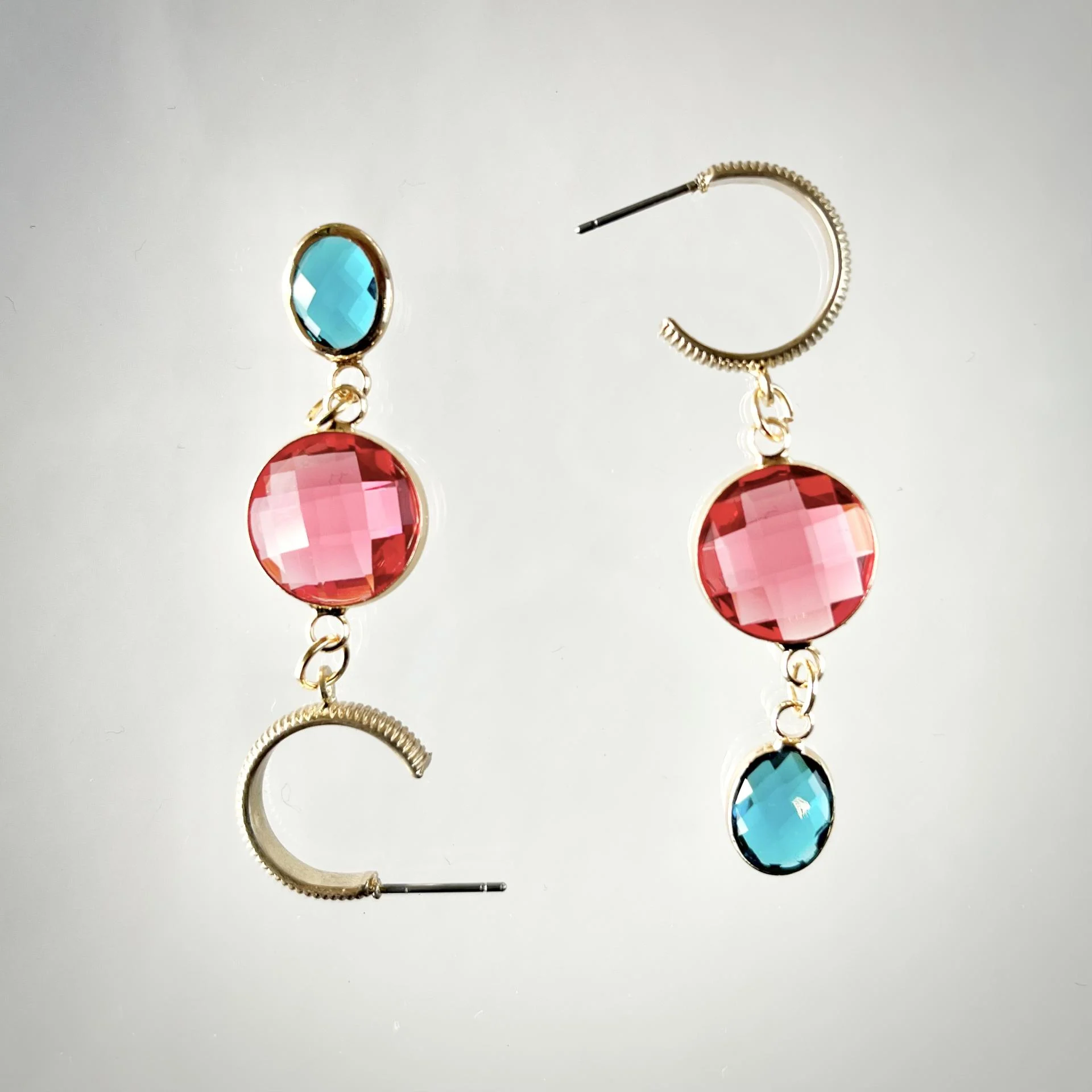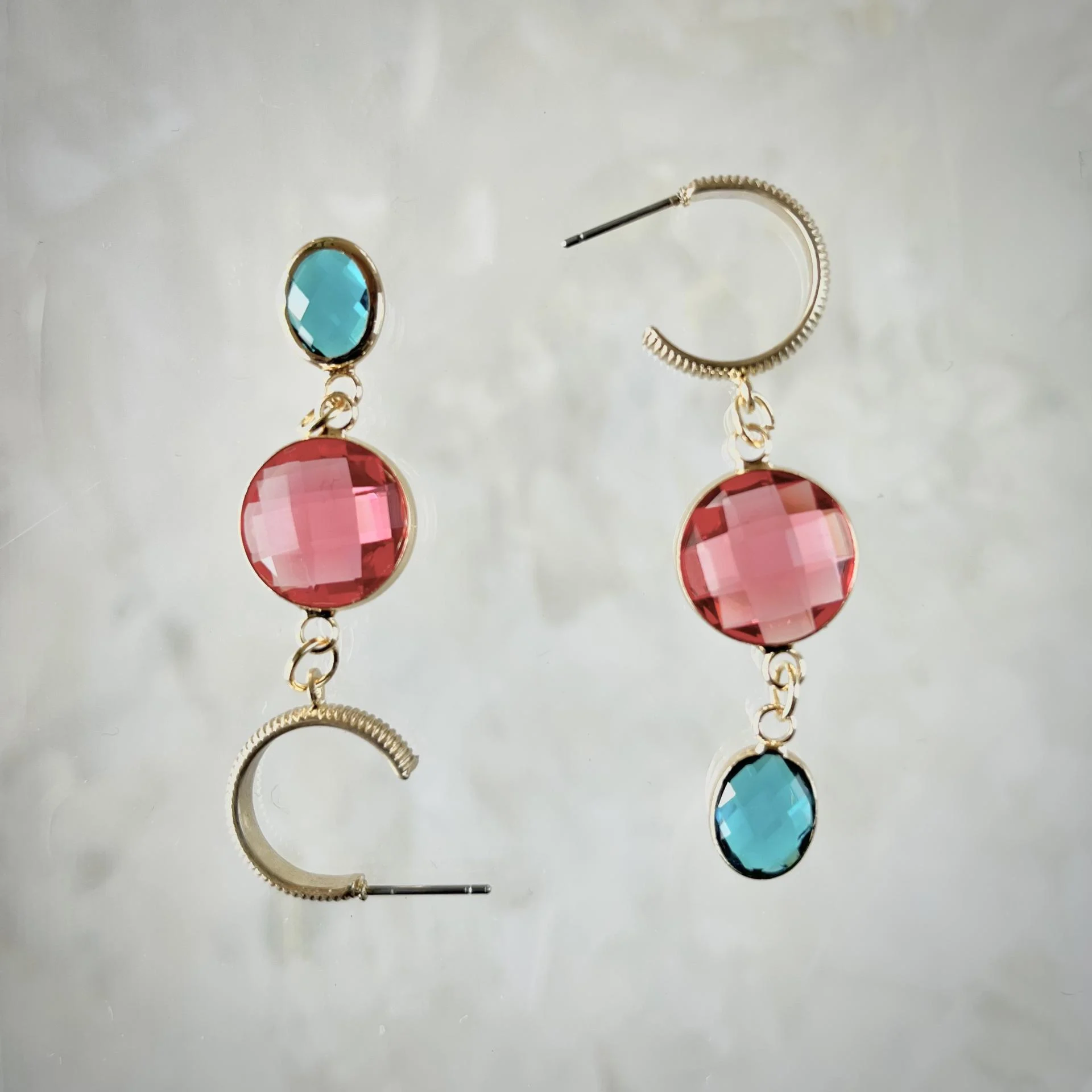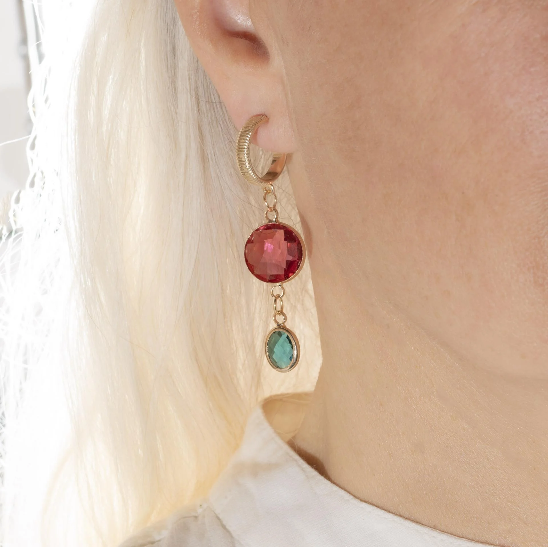Délicates et lumineuses, ces boucles d'oreilles associent l'éclat du cristal à la chaleur du laiton doré. Leur touche de couleur capte la lumière avec subtilité, apportant une élégance naturelle à chaque mouvement.