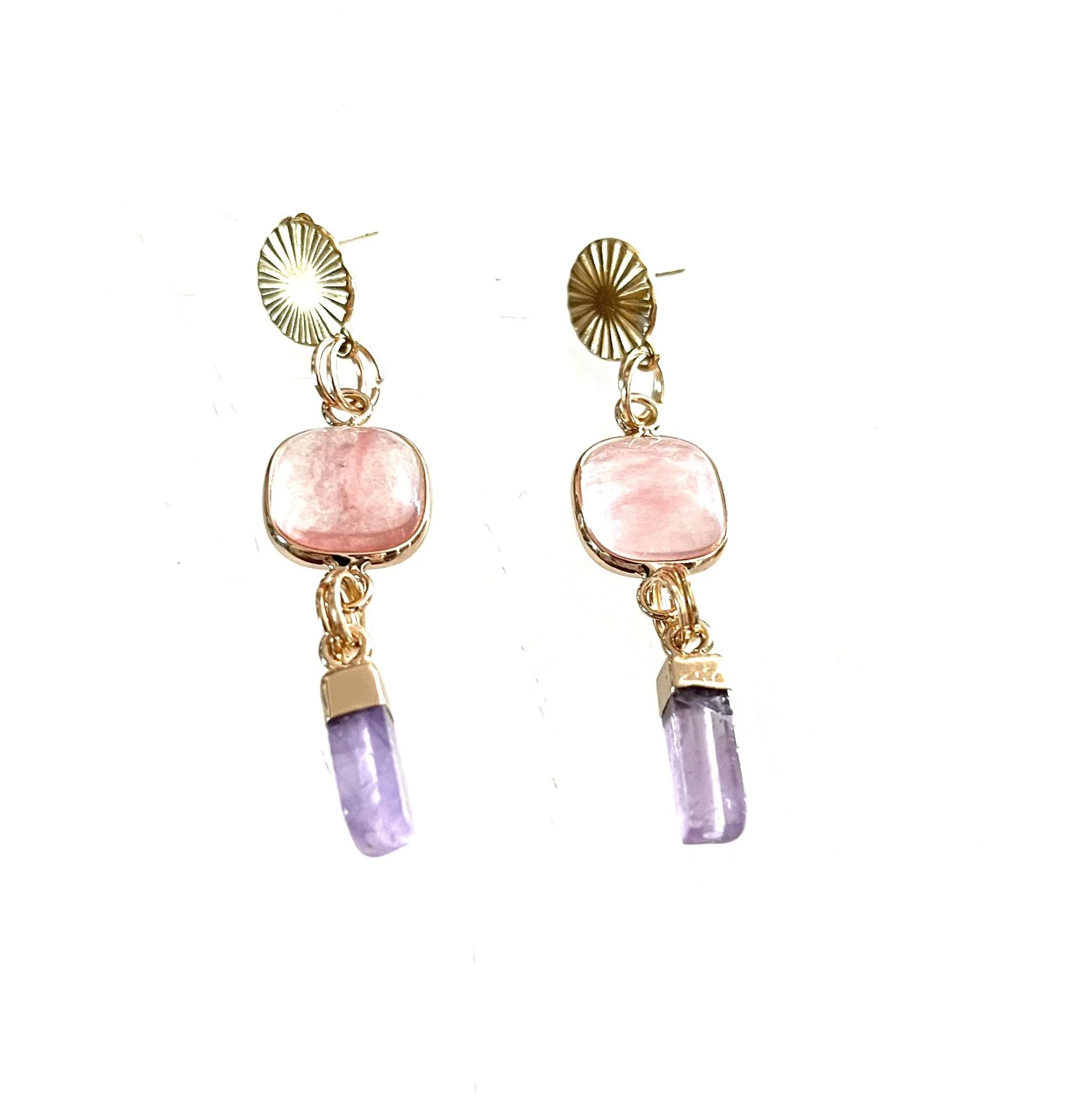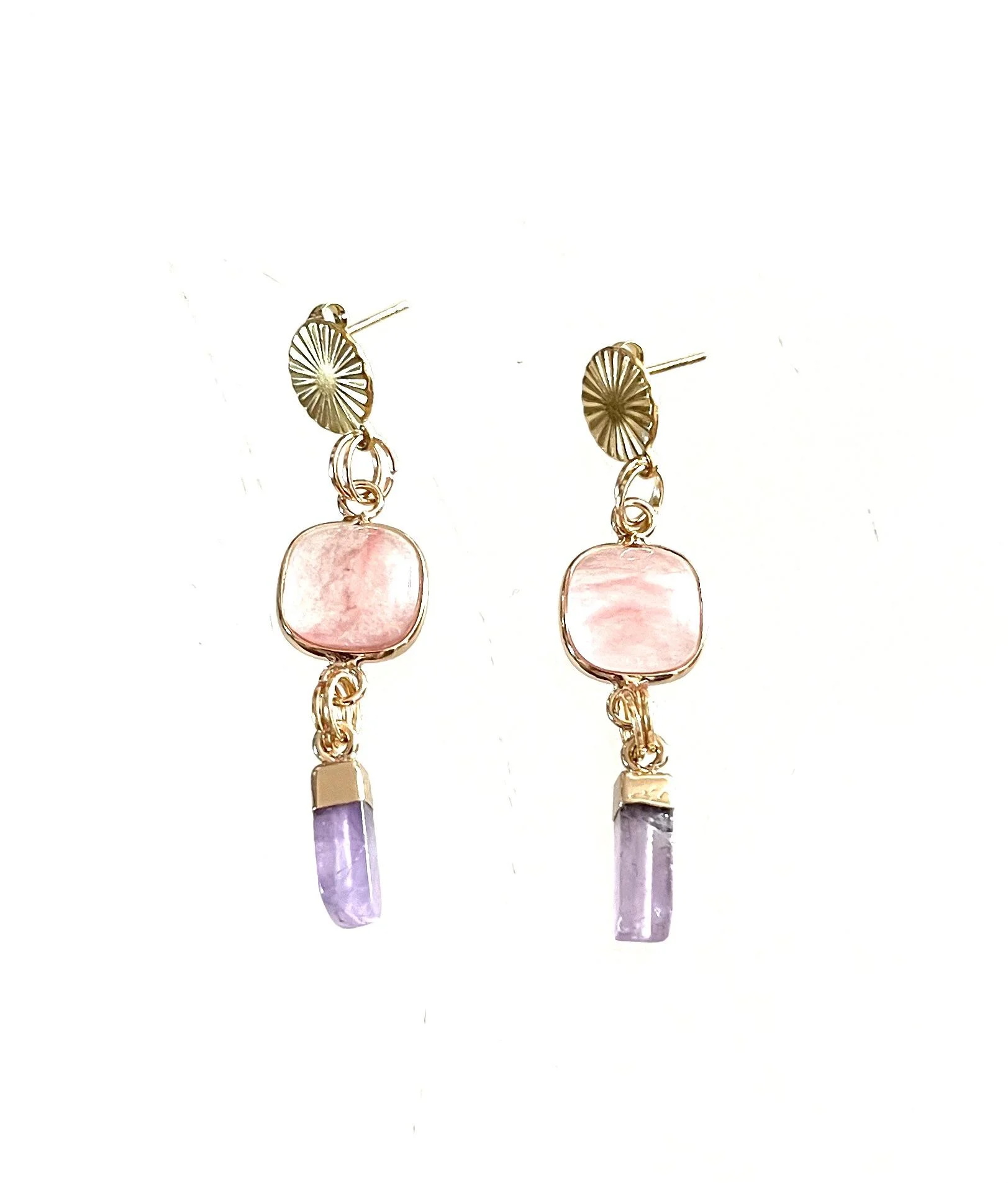 Alliance délicate de quartz rose, pierre de douceur, et d'améthyste, symbole de sérénité. Monture en acier inoxydable doré pour un bijou raffiné et intemporel.