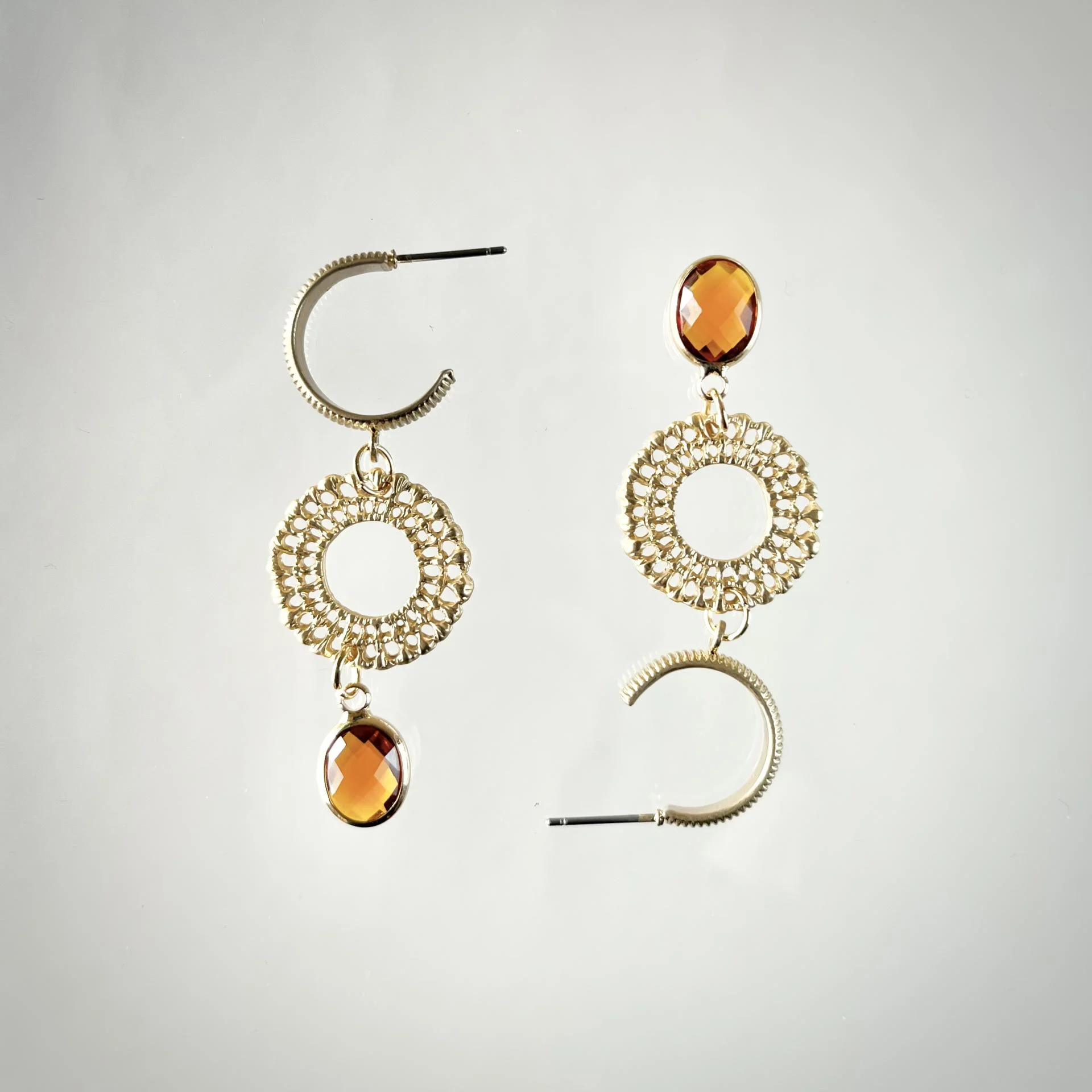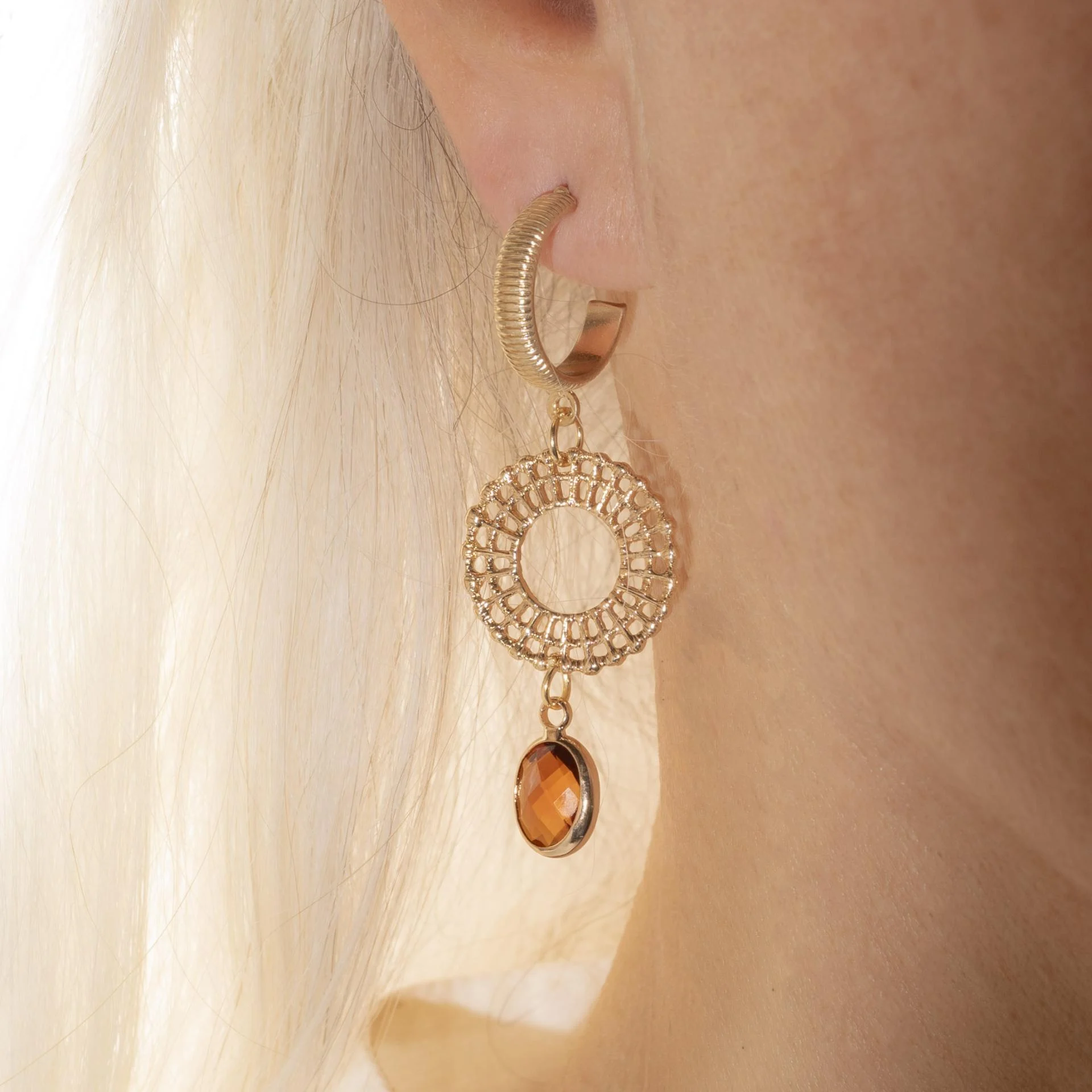Délicates et lumineuses, ces boucles d'oreilles associent l'éclat du cristal à la chaleur du laiton doré. Leur touche de couleur capte la lumière avec subtilité, apportant une élégance naturelle à chaque mouvement.
