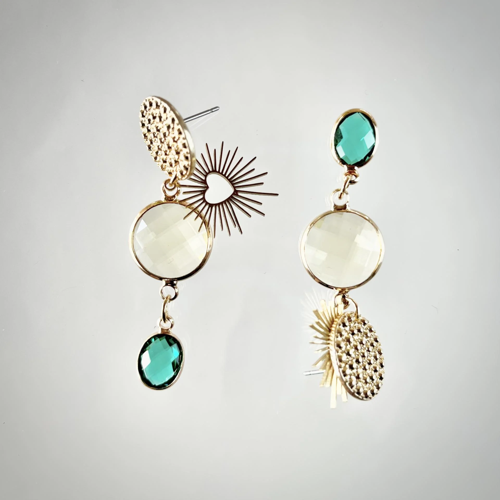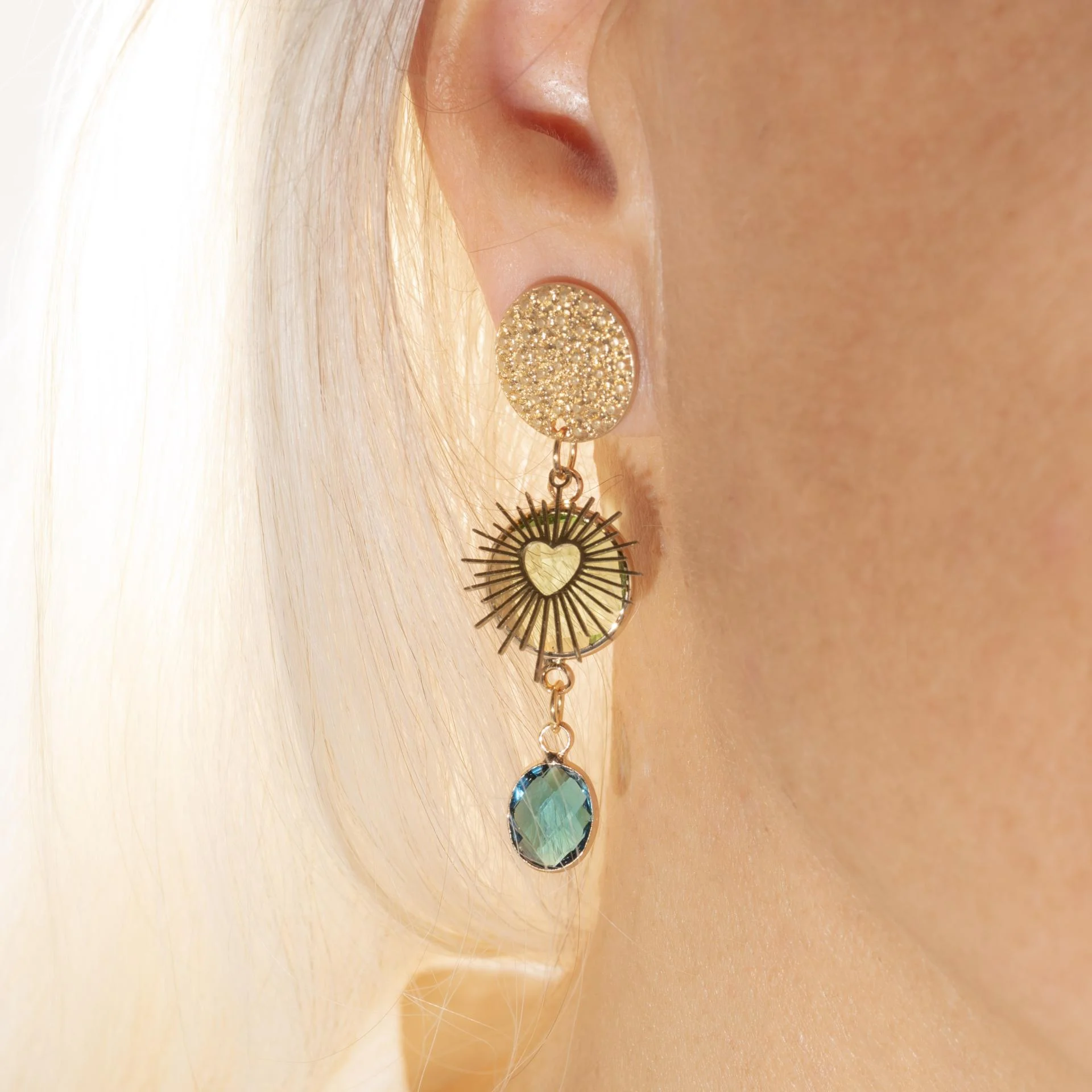 Délicates et lumineuses, ces boucles d'oreilles associent l'éclat du cristal à la chaleur du laiton doré. Leur touche de couleur capte la lumière avec subtilité, apportant une élégance naturelle à chaque mouvement.