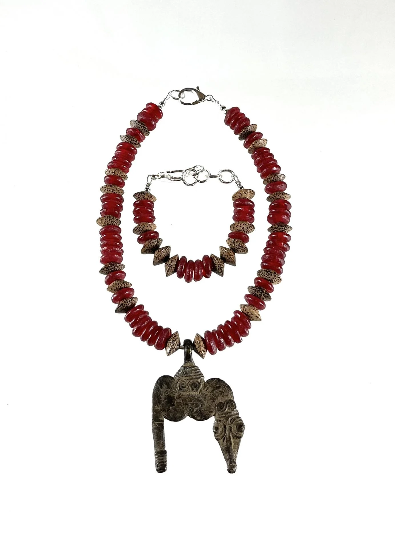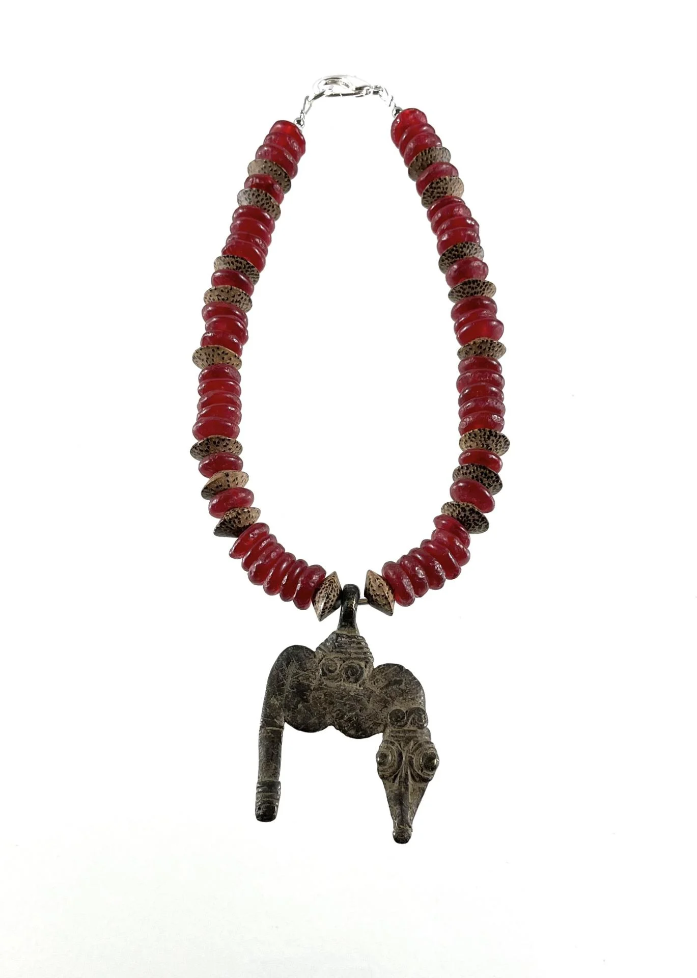 Collier ethnique en verre rouge et pendentif bronze.